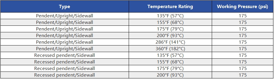 •Operating Temp:68°C(orange glass bulb)and 79°C(red glass bulb)
