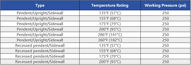 •Operating Temp:68°C(orange glass bulb)and 79°C(red glass bulb)